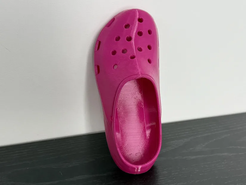 We decided to go with something a little different for the final print in our testing: a wearable Croc-style shoe. The print took about 7.5 hours to complete using Flashforge Magenta TPU. We reduced the model to 70% of its original size in order to ensure it would fit on the build plate because of the AD5X’s build volume restrictions.