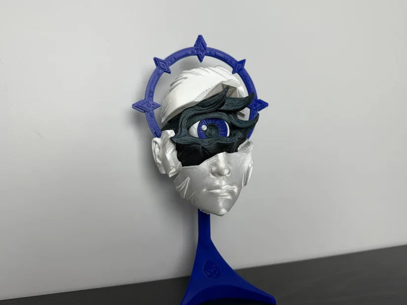 For this wall mask, we used Sunlu Silk White PLA, Sunlu Blue PLA Plus 2.0, and Flashforge Obsidian PLA. The parts fit together cleanly and snugly, with no visible flaws, overhang issues, or warping. While the design itself is relatively simple compared to some of Pipe Cox’s more elaborate masks, the strategic use of color really makes the final result stand out.